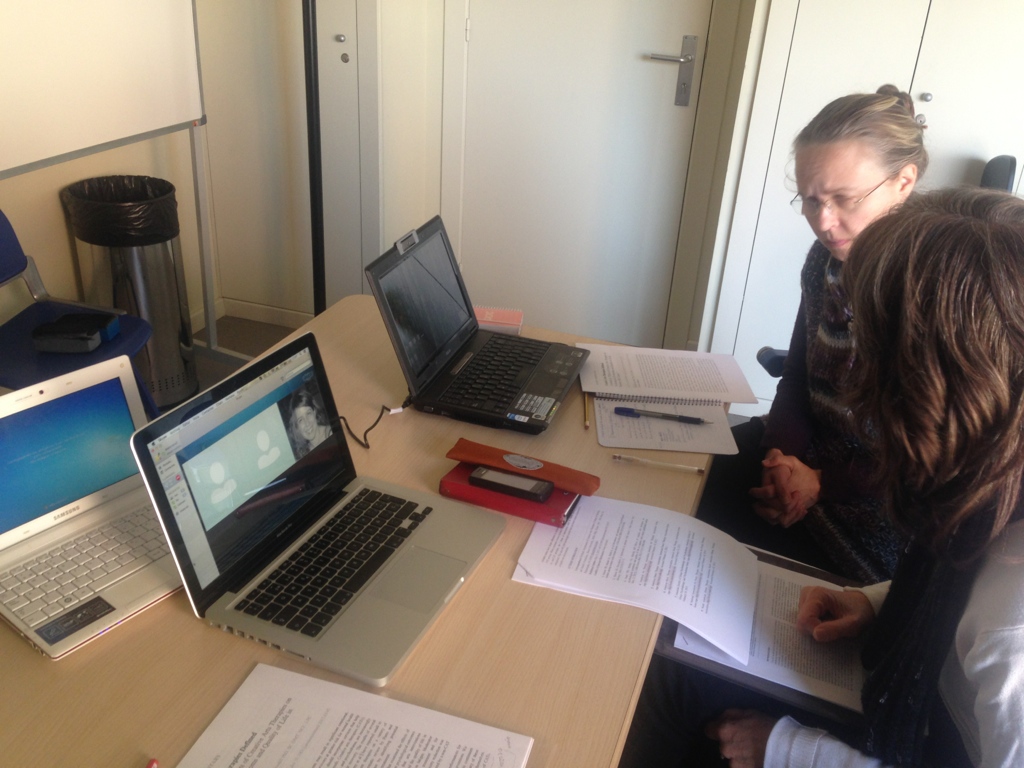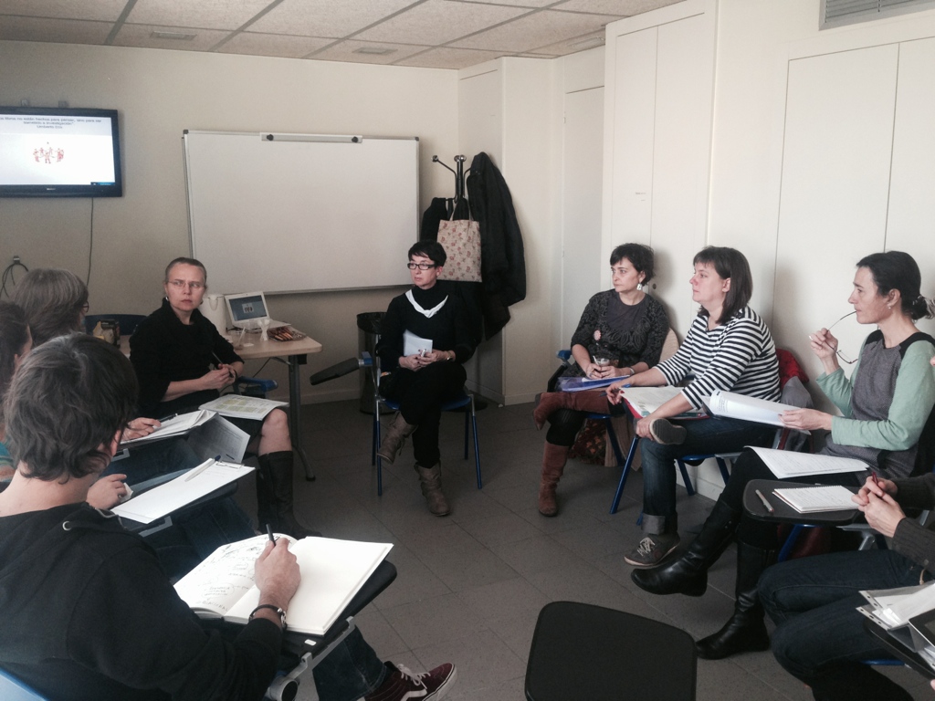 Fuimos pocos participantes, pero muy motivados y nos aproximamos, a través de la lectura de un artículo internacional, a los diferentes enfoques metodológicos de investigación. Estos representan la vía para generar la evidencia en la cual basar nuestra práctica clínica. También conocimos los fundamentos de los análisis de calidad, que podemos realizar en el día a día arteterapéutico, de manera a trabajar con más rigor y darlo a conocer a las instituciones. Luego, nos acercamos a una aplicación de investigación en medio hospitalario. Y para terminar, mediante los materiales plásticos del taller, experimentamos la integración de nuestras vivencias de todo el día e inquietudes personales sobre la cuestión, gracias a los contenidos formales y simbólicos de nuestras producciones creativas.